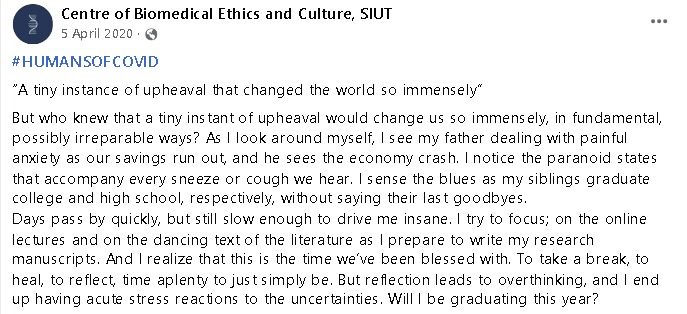 One of the several posts from the #HumansOfCOVID campaign series I created at CBEC, featuring my illustration and a colleague's pandemic experience.